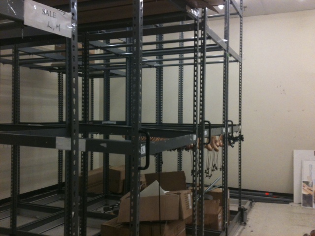 MOBILE STORAGE SHELVING USED, GOOD CONDITION WHAT IS INCLUDED: (5 sections) Each section is 36″ wide x 10′ long x 10′ high mobile sections with wire grate shelving (5) 36″ wide x 10′ long aluminum mobile bases Floor mounted tracks which slide very smoothly. You may make this system mobile or stationary. Wood shelves available at an extra price. This storage system can be used for shelves or hanging clothes. This is a commercial heavy duty system. This unit has been disassembled and is easy to reassemble Pipp Storage system. WHERE DID THIS UNIT COME FROM: This unit was previously used in a local retail clothing store.